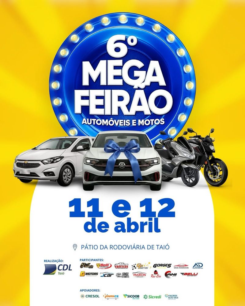 Taió se prepara para receber mais uma grande oportunidade para quem deseja trocar ou adquirir um veículo. Nos dias 11 e 12 de abril, acontece o 6º Mega Feirão de Automóveis e Motos, no pátio da rodoviária do município, reunindo diversas opções para todos os gostos e bolsos.