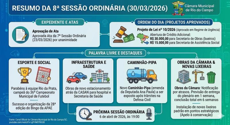 A Câmara Municipal de Rio do Campo realizou, no dia 30 de março de 2026, a 8ª Sessão Ordinária do ano, marcada pela aprovação de projeto importante e debates relevantes sobre infraestrutura, saúde e ações comunitárias.