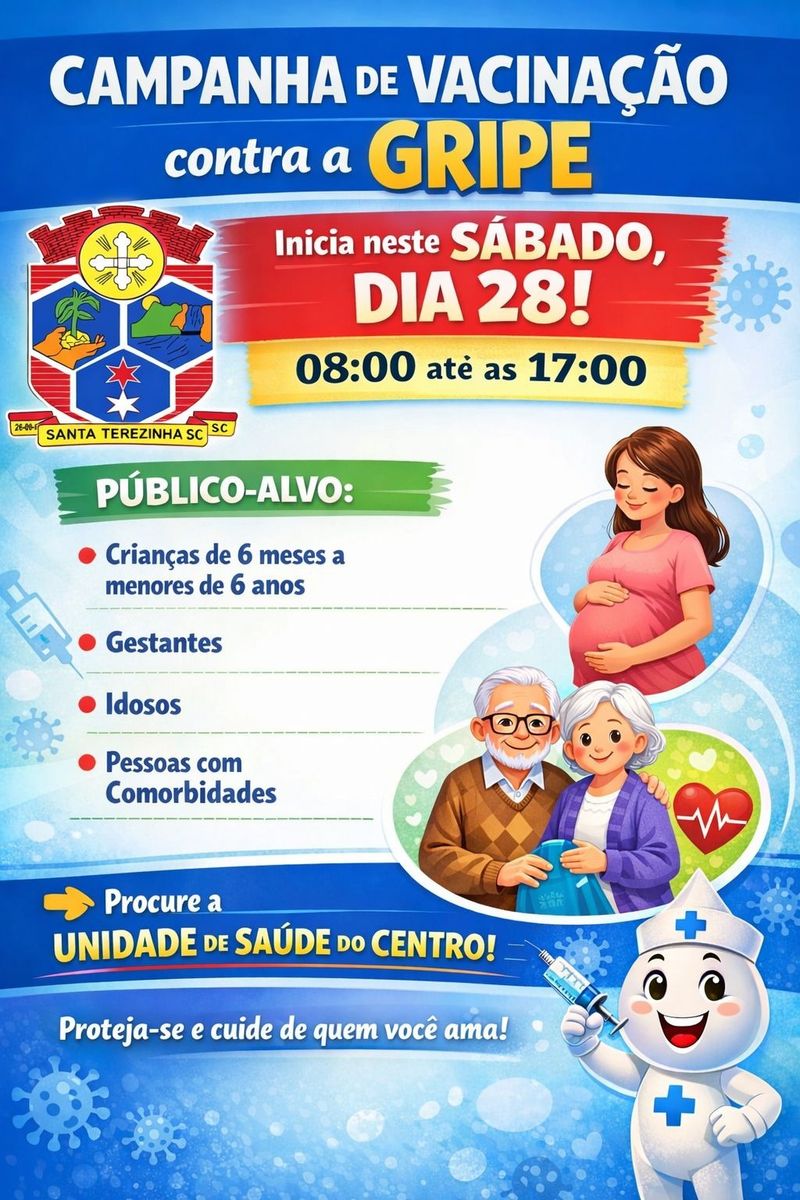 A Secretaria Municipal de Saúde de Santa Terezinha informa que a campanha de vacinação contra a gripe inicia neste sábado, dia 28, com atendimento das 08h às 17h, na Unidade de Saúde do Centro.