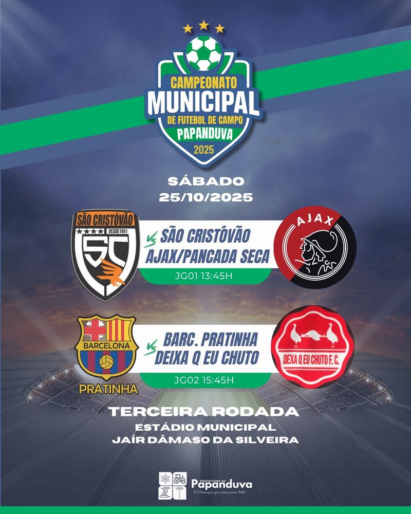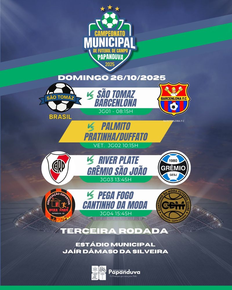 O final de semana promete ser de muita bola rolando e emoção em Papanduva. A terceira rodada do Campeonato Municipal de Futebol de Campo 2025 acontece neste sábado e domingo, no Estádio Municipal Jair Dâmaso da Silveira.