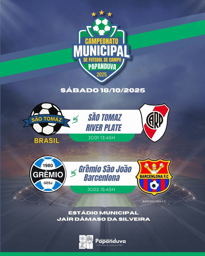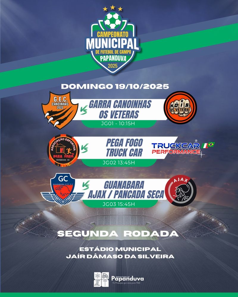 Papanduva se prepara para mais um fim de semana de muita bola rolando! A segunda rodada do Campeonato Municipal de Futebol de Campo 2025 acontece neste sábado (18) e domingo (19), no Estádio Municipal Jair Dâmaso da Silveira, prometendo disputas acirradas e muita emoção para os torcedores.