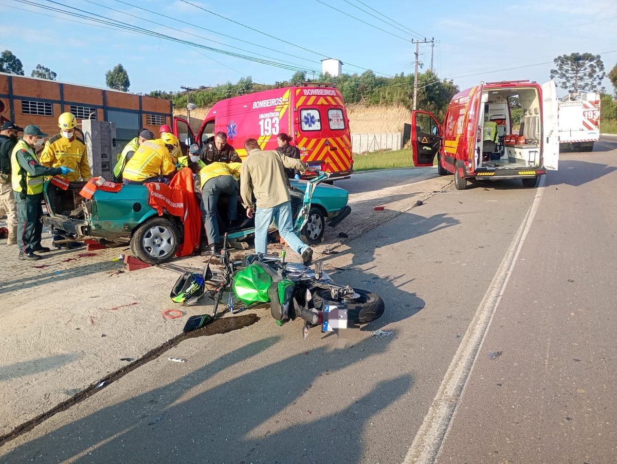 Colisão entre carro e moto deixa três feridos na BR-280, em Rio Negrinho