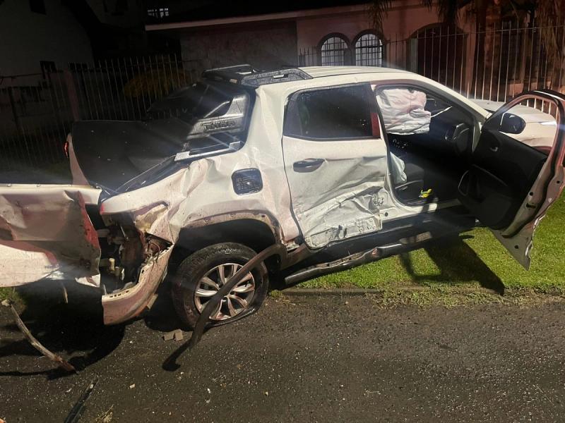 Com o impacto, a Fiat Toro acabou colidindo contra o muro de uma residência, derrubando parte da estrutura e um poste de energia elétrica.