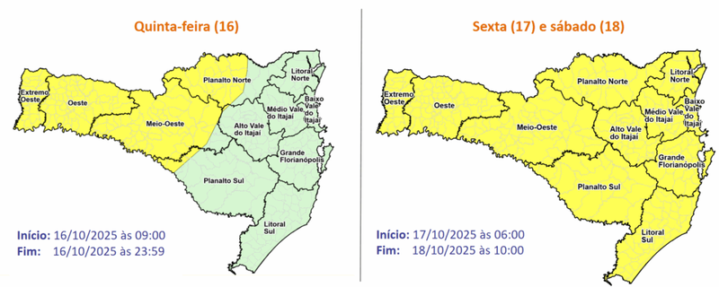 A Defesa Civil de Santa Catarina emitiu um alerta para a formação de uma frente fria que deve provocar temporais isolados e chuva intensa entre esta quinta-feira (16) e a madrugada de sábado (18).