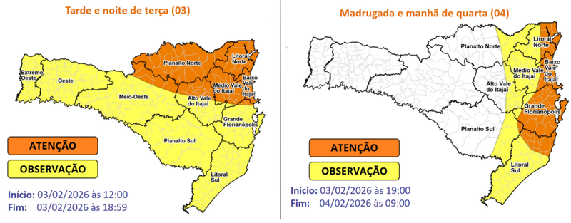 Na noite de terça, o processo de formação de uma baixa pressão na costa entre Sul e Sudeste do Brasil, reforça as instabilidades no leste de SC, aumentando o risco para temporais com chuva intensa e persistente. Essa condição persiste durante a madrugada e manhã de quarta-feira (04), especialmente no Litoral Norte, Baixo Vale do Itajaí, Grande Florianópolis e parte do Litoral Sul, onde o risco é maior para alagamentos e enxurradas.