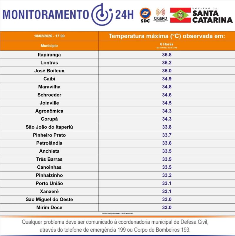 A tarde desta quarta-feira (18) foi de temperaturas elevadas em Santa Catarina, com diversos municípios registrando máximas acima dos 33°C, conforme dados do monitoramento estadual às 17h.
