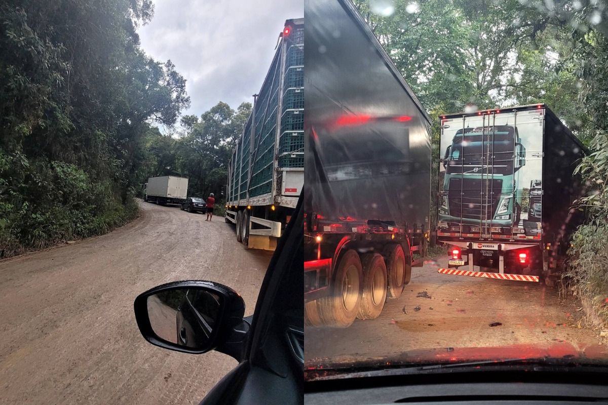 Segundo o relato, na noite de segunda-feira, motoristas ficaram parados na estrada após dois caminhões se enroscarem em um trecho estreito do desvio. Um dos veículos acabou ficando preso próximo à beira de uma encosta, com risco de queda, o que provocou a interdição total da passagem.