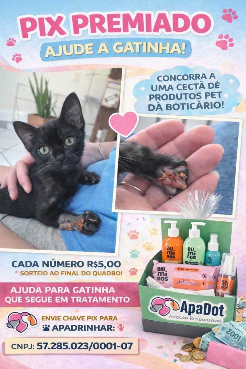 Cada número custa R$ 5,00, e ao final do quadro será realizado um sorteio de uma cesta com produtos pet. Todo o valor arrecadado será destinado ao tratamento do animal, que precisa de cuidados contínuos.