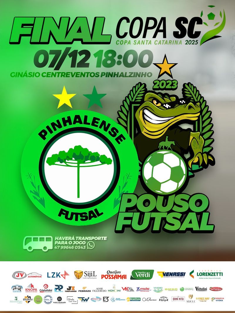 Neste domingo (07), o Pouso Futsal vai à Pinhalzinho disputar o primeiro jogo da final da Copa SC. O jogo será às 18h, no Centreventos, contra o Pinhalense Futsal Zagonel.