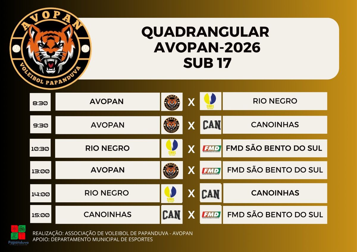 Papanduva recebe neste sábado (14)o Quadrangular AVOPAN 2026 – Sub-17 feminino, evento que reúne equipes da região para uma rodada de jogos de voleibol.