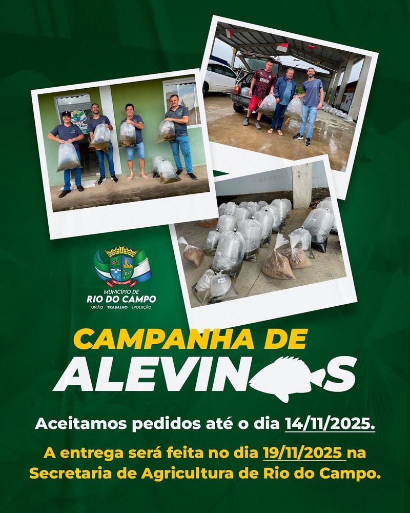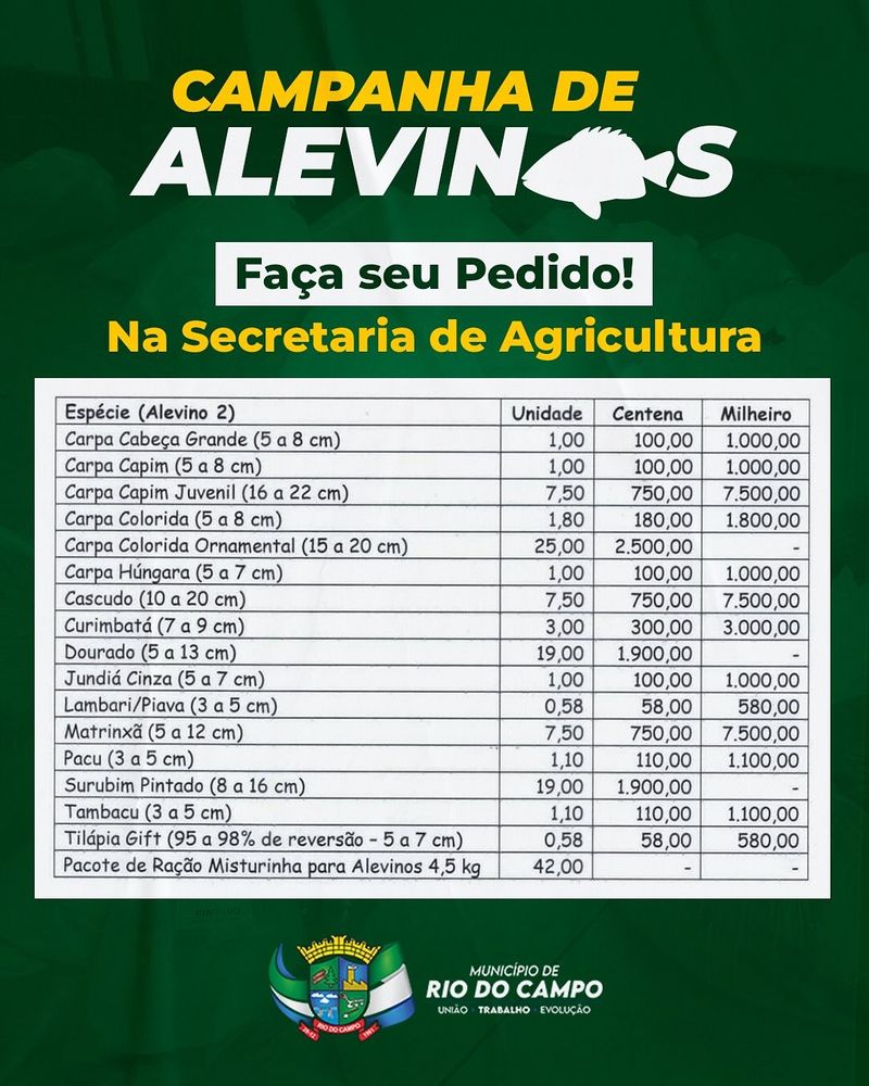 A Secretaria de Agricultura de Rio do Campo está realizando mais uma edição da Campanha de Alevinos!
