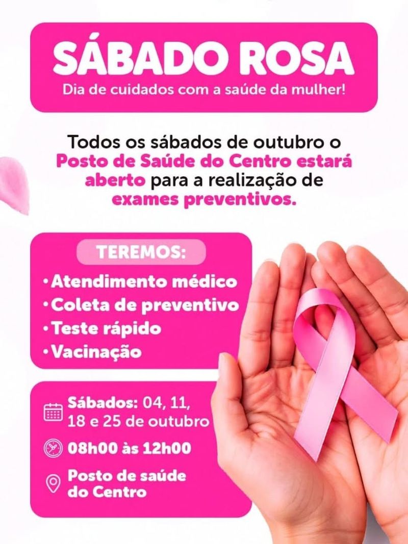 Durante todos os sábados de outubro, o Posto de Saúde do Centro estará aberto para a realização de exames preventivos e outras ações de promoção à saúde da mulher.