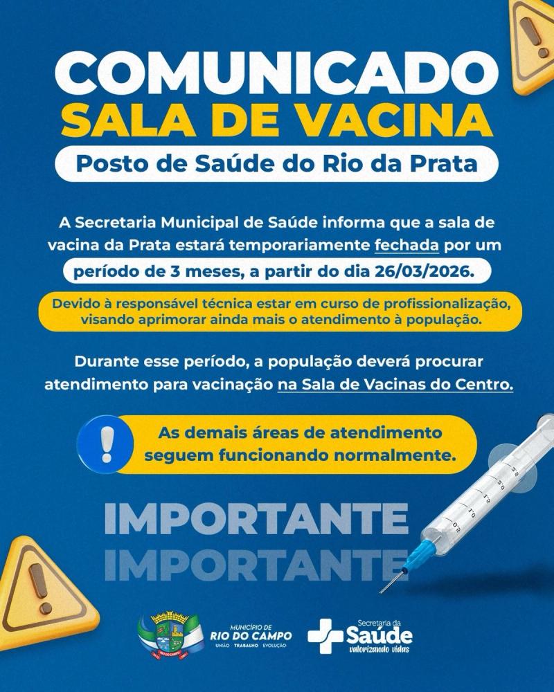 A Secretaria Municipal de Saúde de Rio do Campo informa que a sala de vacinas do Posto de Saúde do Rio da Prata está temporariamente fechada por um período de três meses.
