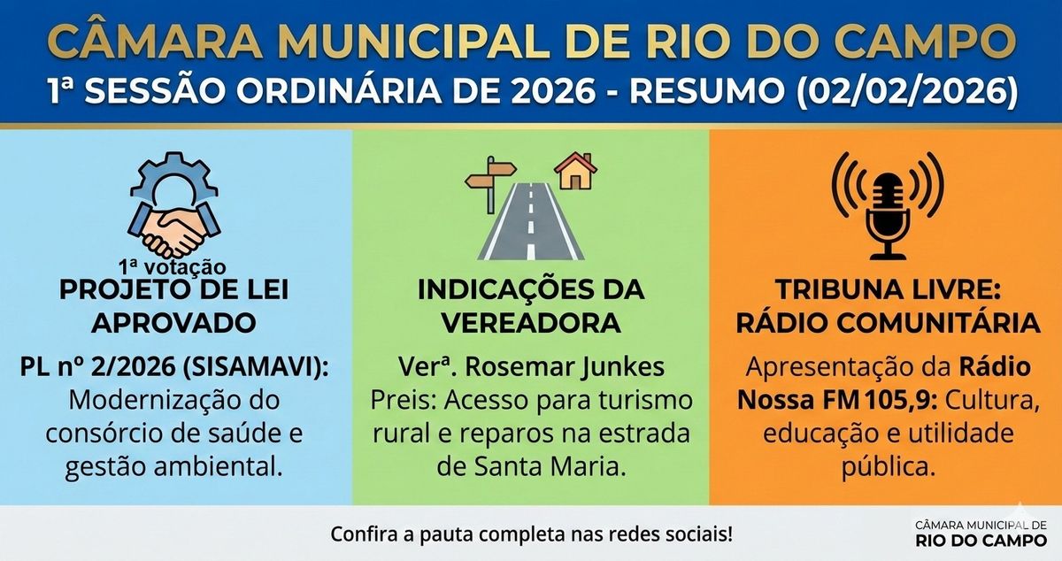 A Câmara Municipal de Rio do Campo realizou, no dia 2 de fevereiro de 2026, a 1ª Sessão Ordinária do ano, excepcionalmente na Sala das Comissões, em razão de obras de manutenção no Plenário Pedro Mees.