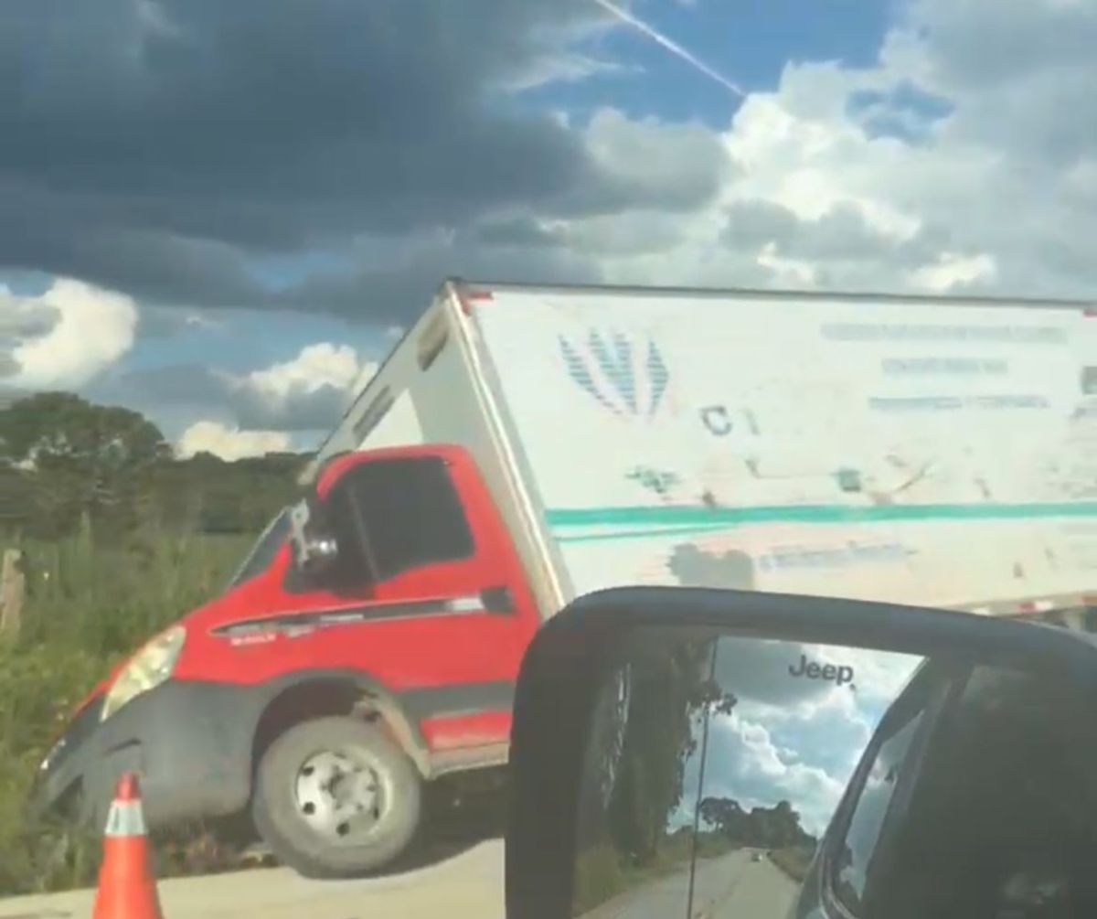 Caminhão baú sai de pista na SC-477 em Major Vieira