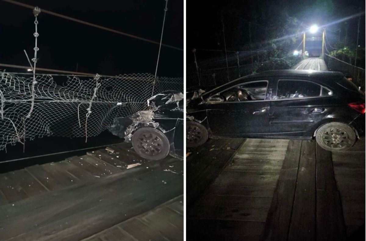 No local, a Polícia Militar encontrou um Chevrolet Onix que havia atingido a estrutura, chegando a romper alguns cabos da ponte.