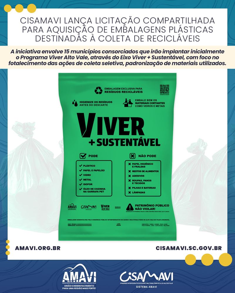A iniciativa envolve 15 municípios consorciados que inicialmente irão implantar o Programa Viver Alto Vale através do Eixo Viver + Sustentável e tem como objetivo fortalecer as ações de coleta seletiva, padronizar os materiais utilizados e garantir maior eficiência logística e econômica aos municípios participantes. Ao todo, está prevista a aquisição de 1.566.876 embalagens plásticas, quantidade definida com base no levantamento e na previsão de demanda apresentada pelos próprios municípios, conforme as condições estabelecidas no edital.