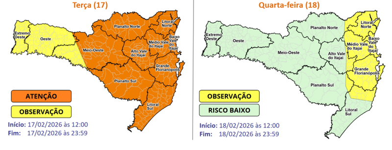 De acordo com o comunicado, as condições de chuva e temporais devem se manter até a quarta-feira, quando o risco tende a diminuir, porém ainda permanece moderado em áreas do Litoral Norte, Médio e Baixo Vale do Itajaí e Grande Florianópolis, além de partes do Alto Vale e Litoral Sul.