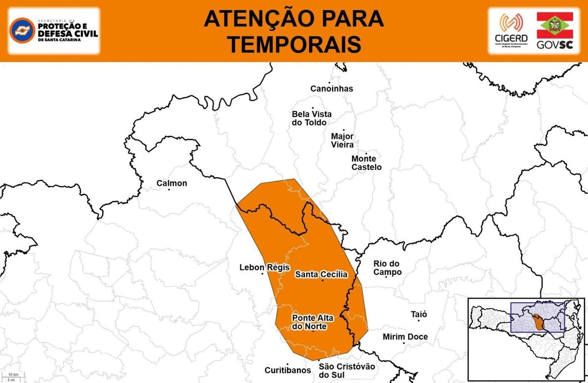 A Defesa Civil de Santa Catarina emitiu um alerta na tarde desta quinta-feira (5) para a possibilidade de temporais nas próximas horas em municípios do Alto Vale e regiões próximas.