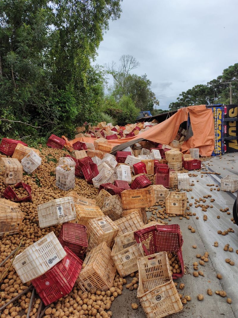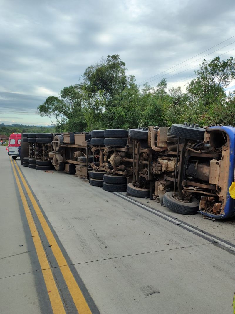 No local, as equipes encontraram um caminhão Scania 400 tombado lateralmente à esquerda, ocupando parte da pista e do acostamento, com a cabine sobre um barranco.