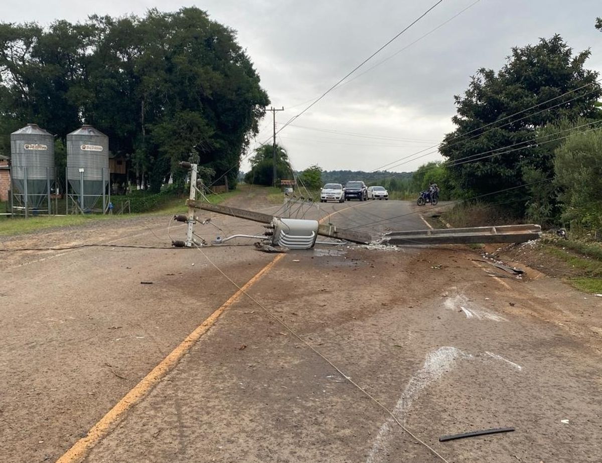 Motorista derruba poste, capota carro e foge do local em Bela Vista do Toldo
