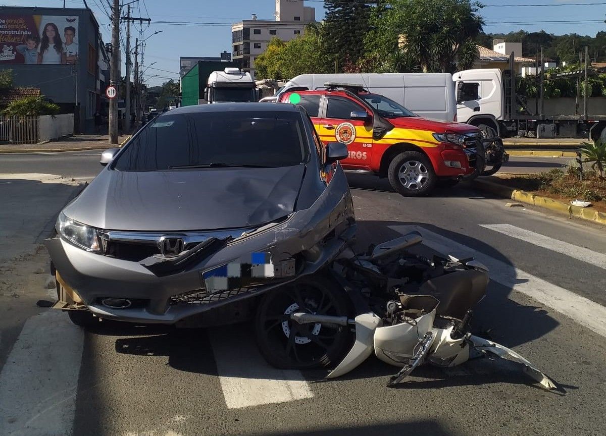 A ocorrência foi atendida pelo Corpo de Bombeiros Militar de Rio do Sul, com o apoio das viaturas ASU-611 e AR-125. No local, as guarnições confirmaram a colisão entre um automóvel Honda prata e uma motocicleta Honda Biz.