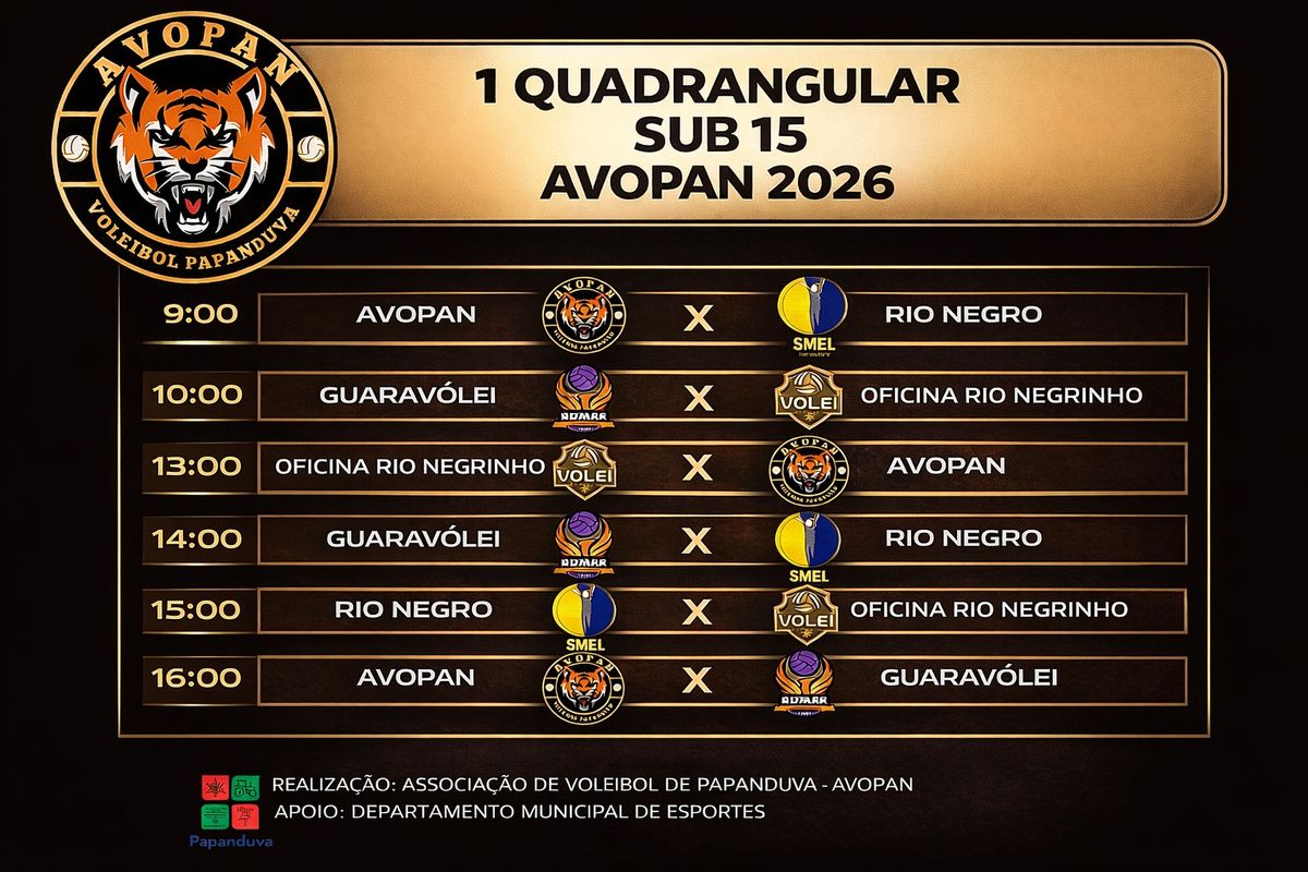 O voleibol de base será destaque em Papanduva no sábado (07/03) com a realização do 1º Quadrangular Sub-15 – AVOPAN 2026. O evento acontece no Ginásio da Escola Maria Avelina, com início às 9h e último jogo previsto para as 16h.
