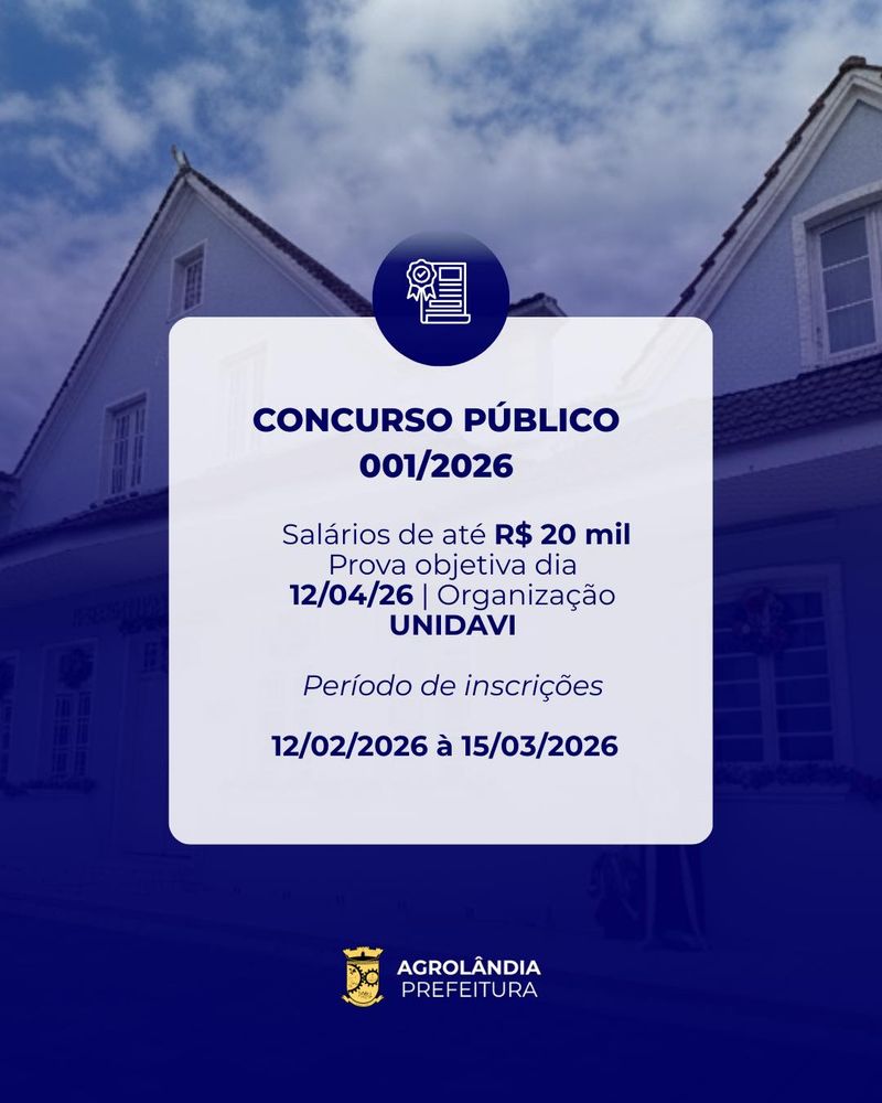 O edital completo, com informações sobre requisitos, carga horária, vencimentos e etapas do concurso, bem como o acesso às inscrições, está disponível nos sites concursos.unidavi.edu.br e agrolandia.sc.gov.br/concursos-publicos/.