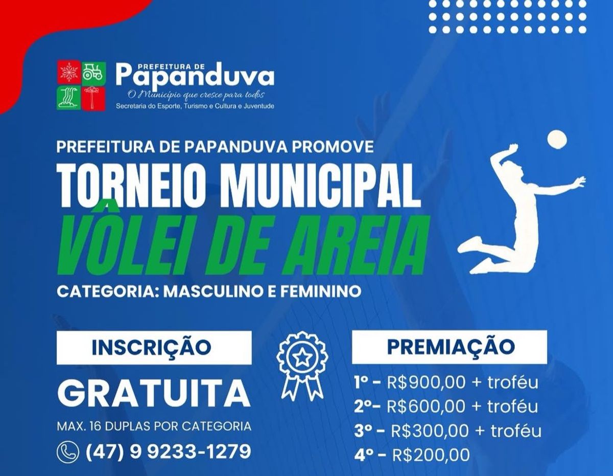 A Prefeitura de Papanduva promove no dia 15 de março o Torneio Municipal de Vôlei de Areia, reunindo atletas nas categorias masculino e feminino. O evento tem como objetivo incentivar a prática esportiva, promover a integração entre os participantes e fortalecer o esporte no município.