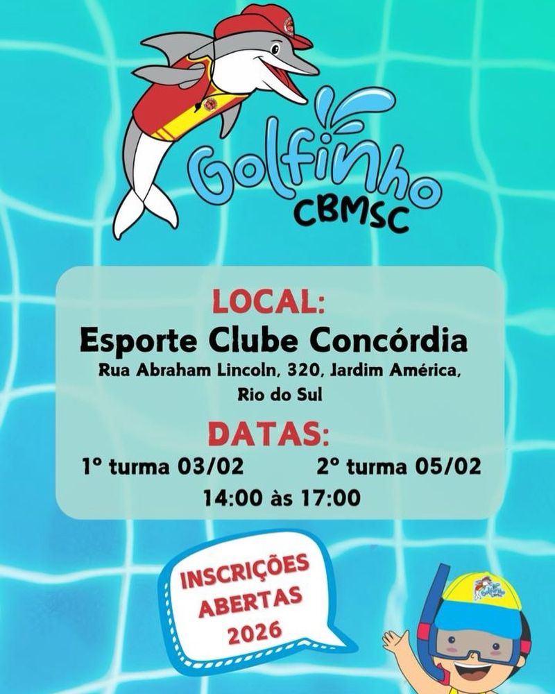 Nos dias 03 e 05 de fevereiro de 2026, o Corpo de Bombeiros Militar de Rio do Sul promoverá o Programa Golfinho — uma iniciativa gratuita do CBMSC, desenvolvida durante a temporada de verão.