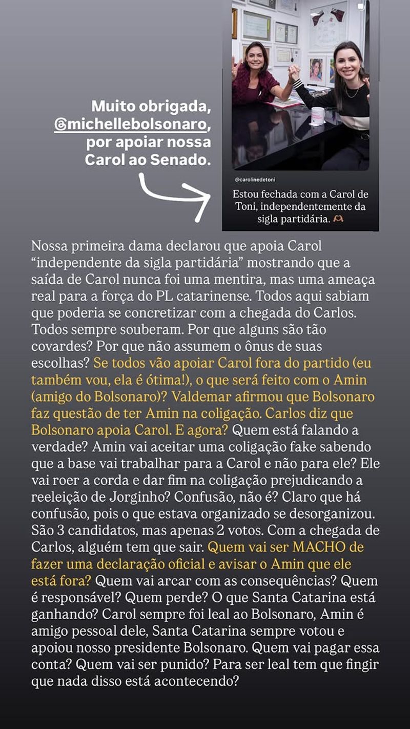 "Quem vai ser MACHO de fazer uma declaração oficial e avisar o Amin que ele está fora? Quem vai arcar com as consequências? Quem é responsável? Quem perde? O que Santa Catarina está ganhando? Carol sempre foi leal ao Bolsonaro, Amin é amigo pessoal dele, Santa Catarina sempre votou e apoiou nosso presidente Bolsonaro. Quem vai pagar essa conta? Quem vai ser punido? Para ser leal tem que fingir que nada disso está acontecendo?”
