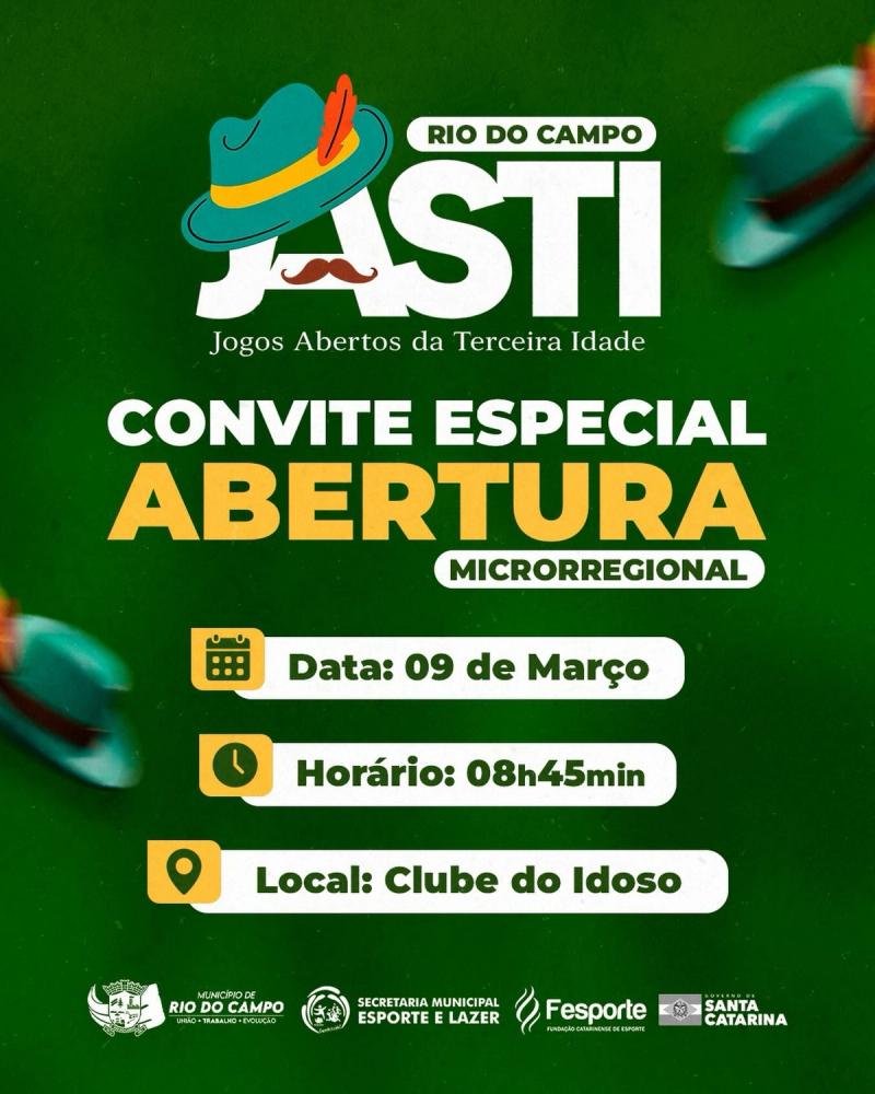 O município de Rio do Campo tem a honra de sediar a etapa microrregional dos Jogos Abertos da Terceira Idade (JASTI), evento que valoriza a vitalidade, a integração e o espírito esportivo da terceira idade.