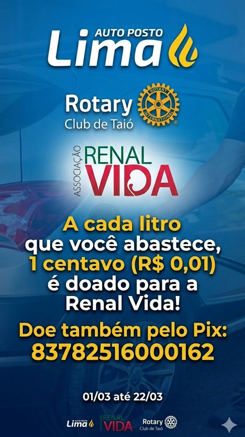 Entre os dias 1º e 22 de março, quem abastecer com gasolina Ipimax no Auto Posto Lima estará contribuindo diretamente com uma causa nobre. A cada litro abastecido, R$ 0,01 será doado ao Projeto Global Renal Vida, em parceria com o Rotary Club.