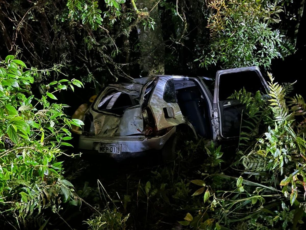 No local, os socorristas encontraram um Volkswagen Gol prata que havia saído da pista após o motorista perder o controle do veículo durante uma curva, segundo relato de um dos ocupantes.